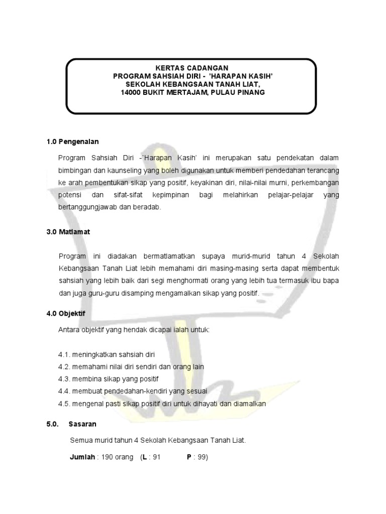 Sasaran Semua murid Tahap 2 seramai 51 orang Ibu bapa murid Tahap. Contoh kertas kerja bagi program latihan kepimpinan nurani. Ini juga yang kondusif untuk motivasi pekerja.